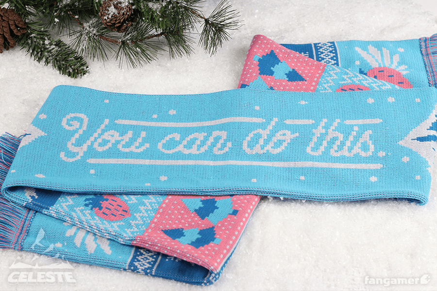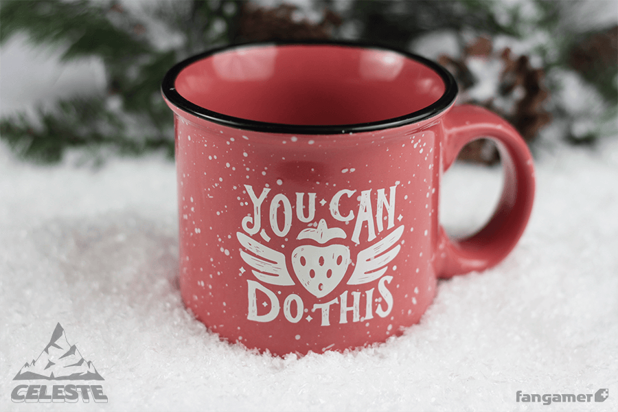 While Celeste’s difficulty level is high, the game keeps sections short and realistic to complete in one process, while still becoming more difficult and never boring over time by including new gameplay mechanics with each chapter (i.e. the golden feather mechanic being added in Chapter 6). The game tries to minimize the distress that the player feels while also not giving too much eustress, which keeps the player stuck in a state that can be referred to as flow. Flow is an experience that Mihaly Csikszentmihalyi describes as “the state in which people are so involved in an activity that nothing else seems to matter; the experience itself is so enjoyable that people will do it even at great cost, for the sheer sake of doing it.” The game sets itself up so that it works within the confines of flow—potentially inadvertently—by not being too challenging yet not too easy. Additionally, it encourages the player to keep progressing through small messages seen between levels and even in the official merchandise, as seen below.